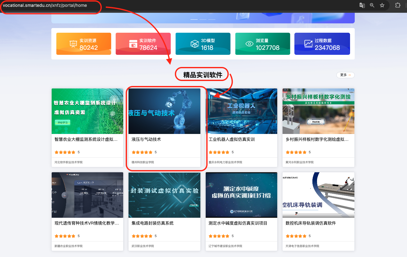 例如,德州科技职院的《液压与气动技术》课程已成功上线国家平台,全国各地区不同学校可互联访问使用。动态提交实训人数、操作数据及实验报告至国家平台,被国家智慧教育公共服务平台首页推荐,评为“精品实训软件”,并在各类排行榜单上名列前茅,为精品课程评选或参加教学竞赛提供支撑