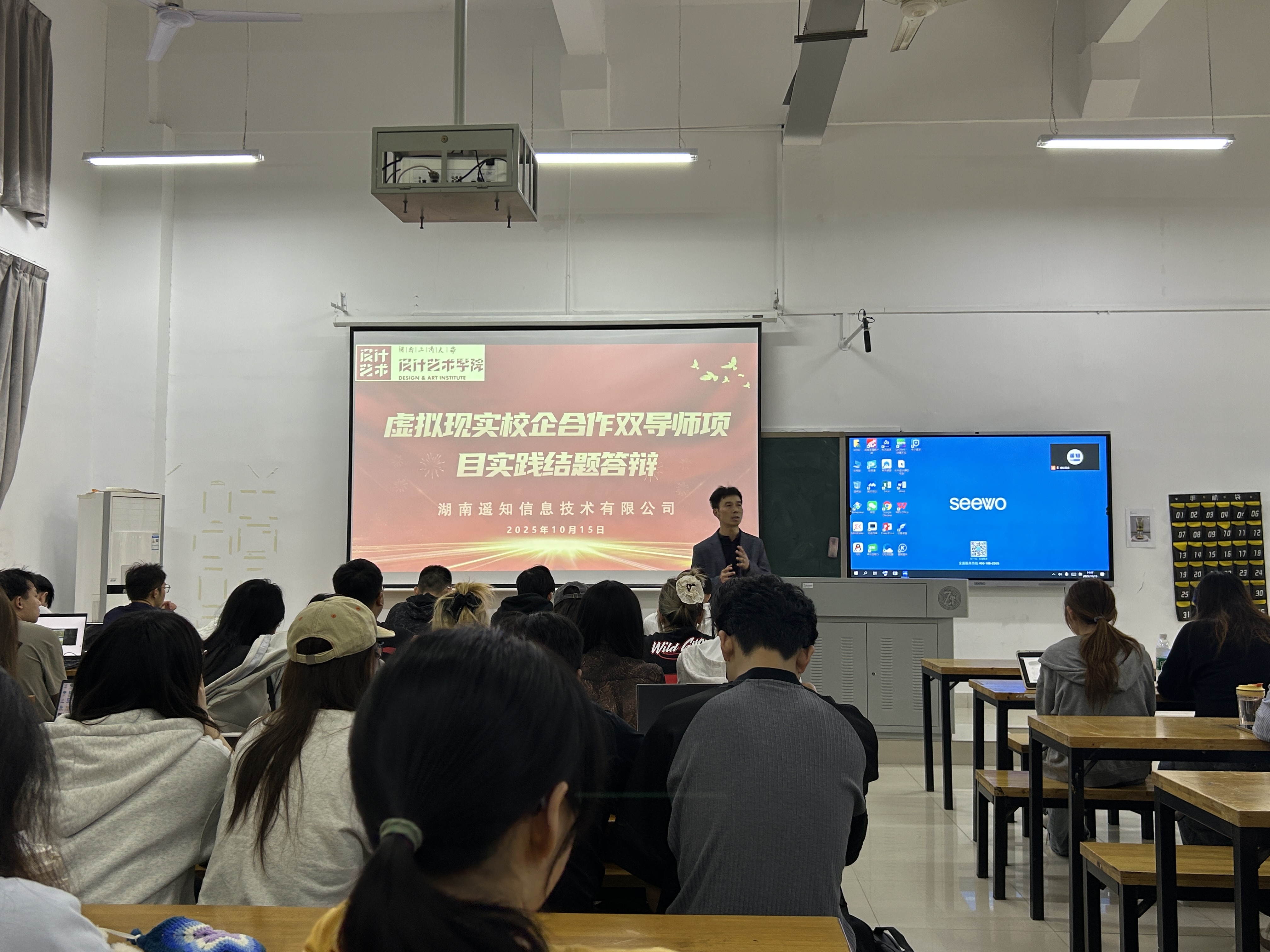 近日,湖南遥知与湖南工商大学成功完成了双导师项目实践——VR室外漫游可视化项目实践的结课答辩,大四3个班的学生们基于虚拟现实技术开发了风景漫游类作品,在学校领导、专业教师和企业专家的带领下,通过2次组织,完成作品展示和答辩。