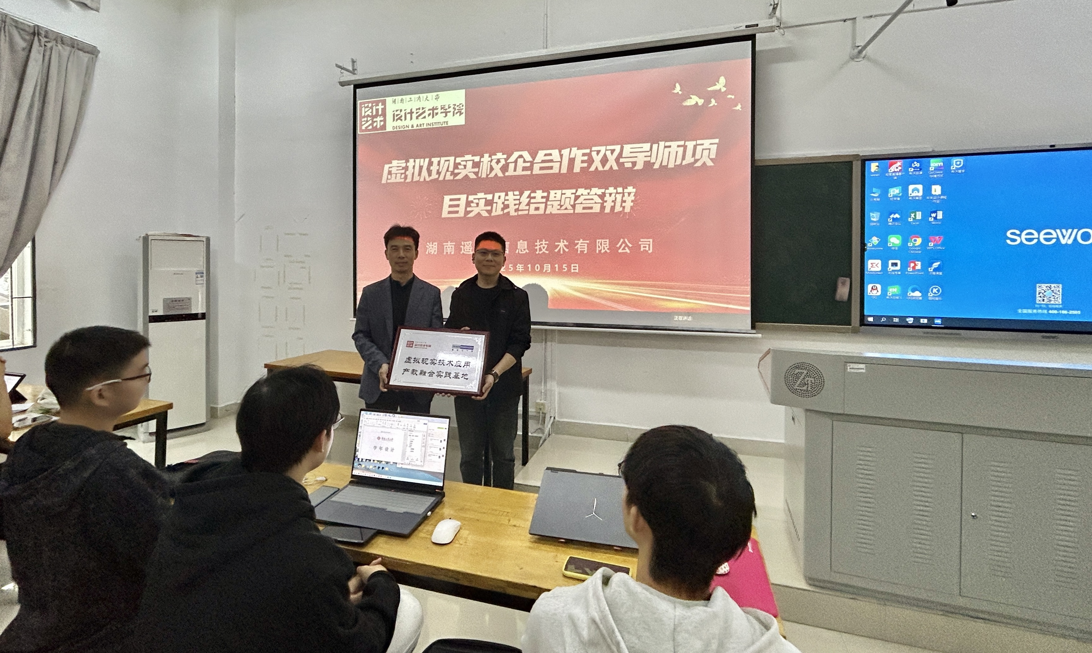 在答辩仪式上,校企双方首先举行了“虚拟现实技术应用产教融合实践基地”的挂牌签约仪式,标志着双方在实践教学资源共建上的深度合作。