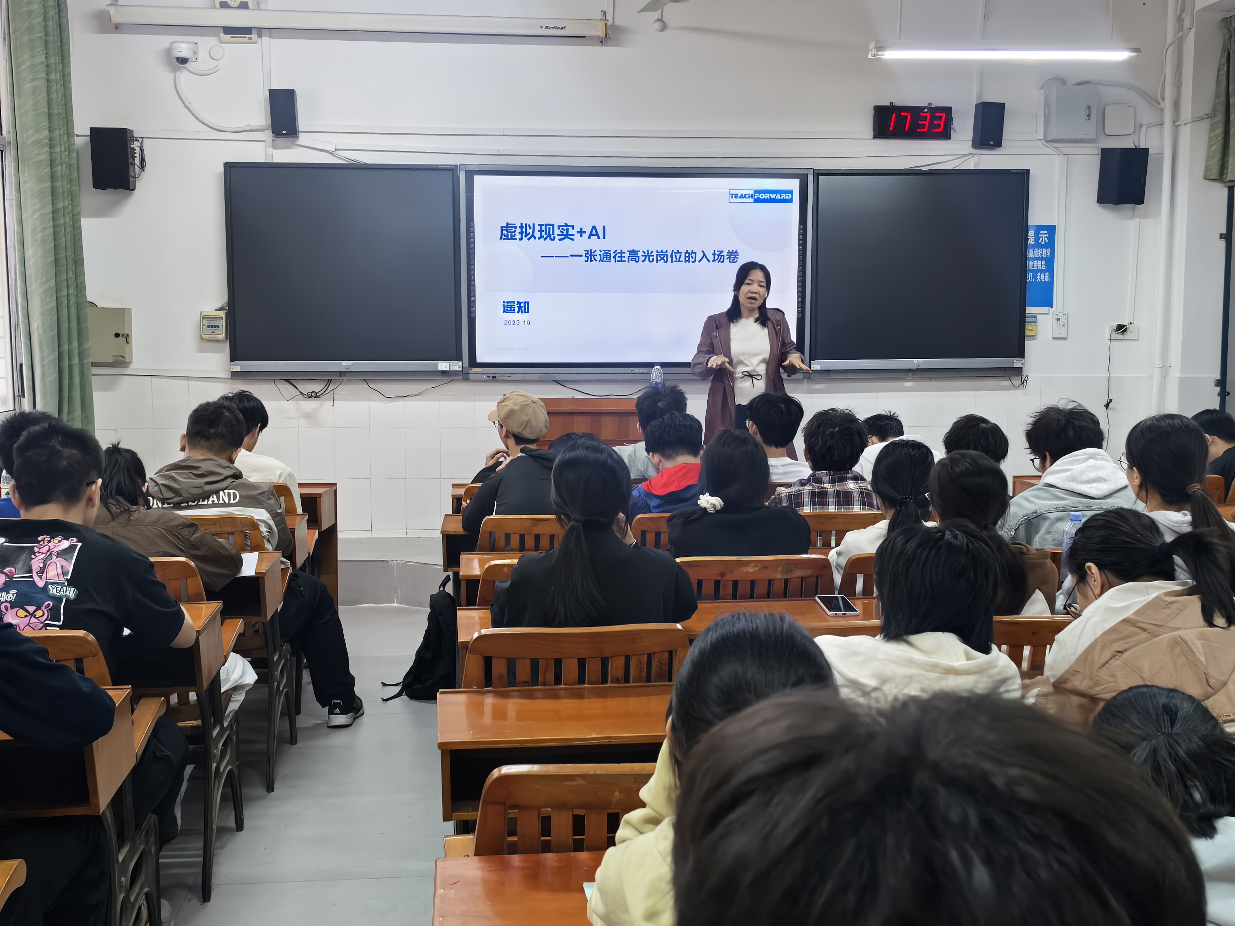 在开学第一课中,企业导师对虚拟现实(VR)、人工智能交互等前沿技术进行深入浅出的剖析,结合行业实际案例展示了这些技术对教育、产业及未来社会发展的深远影响。企业导师指出,数字经济时代对数字媒体技术人才提出了更高的要求,学生需具备跨学科能力,将技术与艺术、创新与实践相结合,才能在未来的职业生涯中脱颖而出。