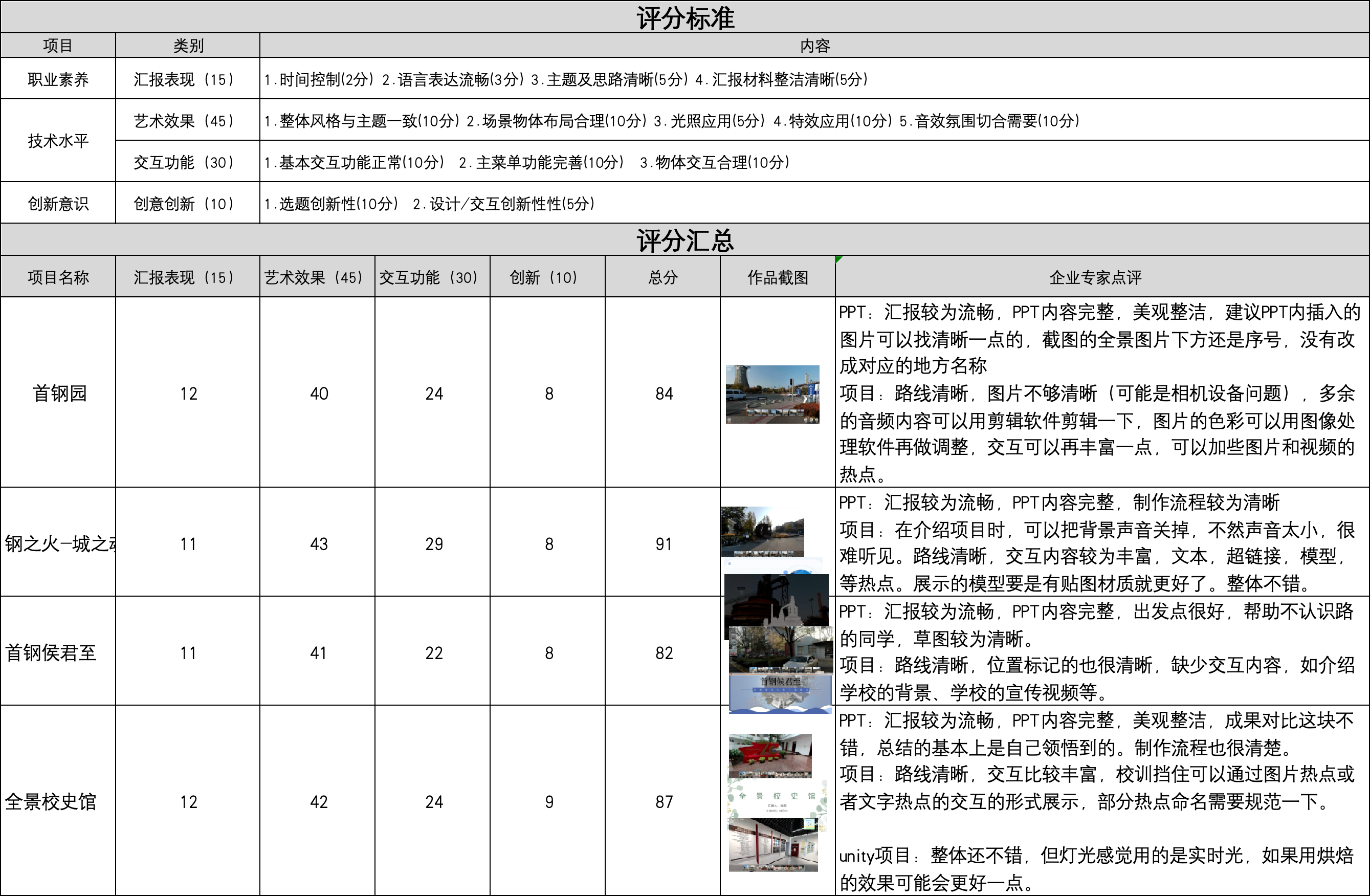汇报过程中,校企双方组成的专家评审组对每个作品进行了细致点评和打分,充分肯定了学生们在技术创新、艺术表现和项目完成度方面的成果。