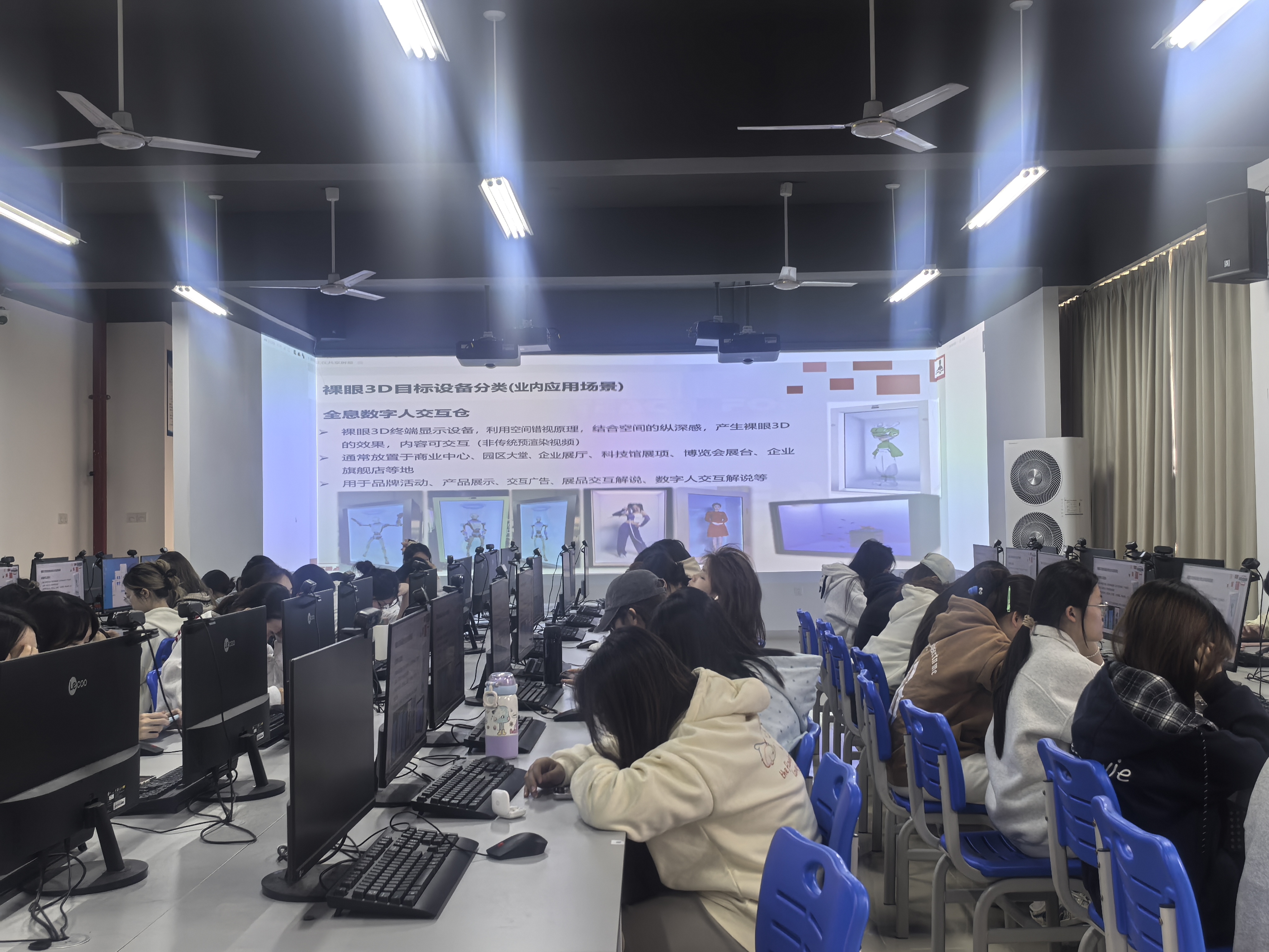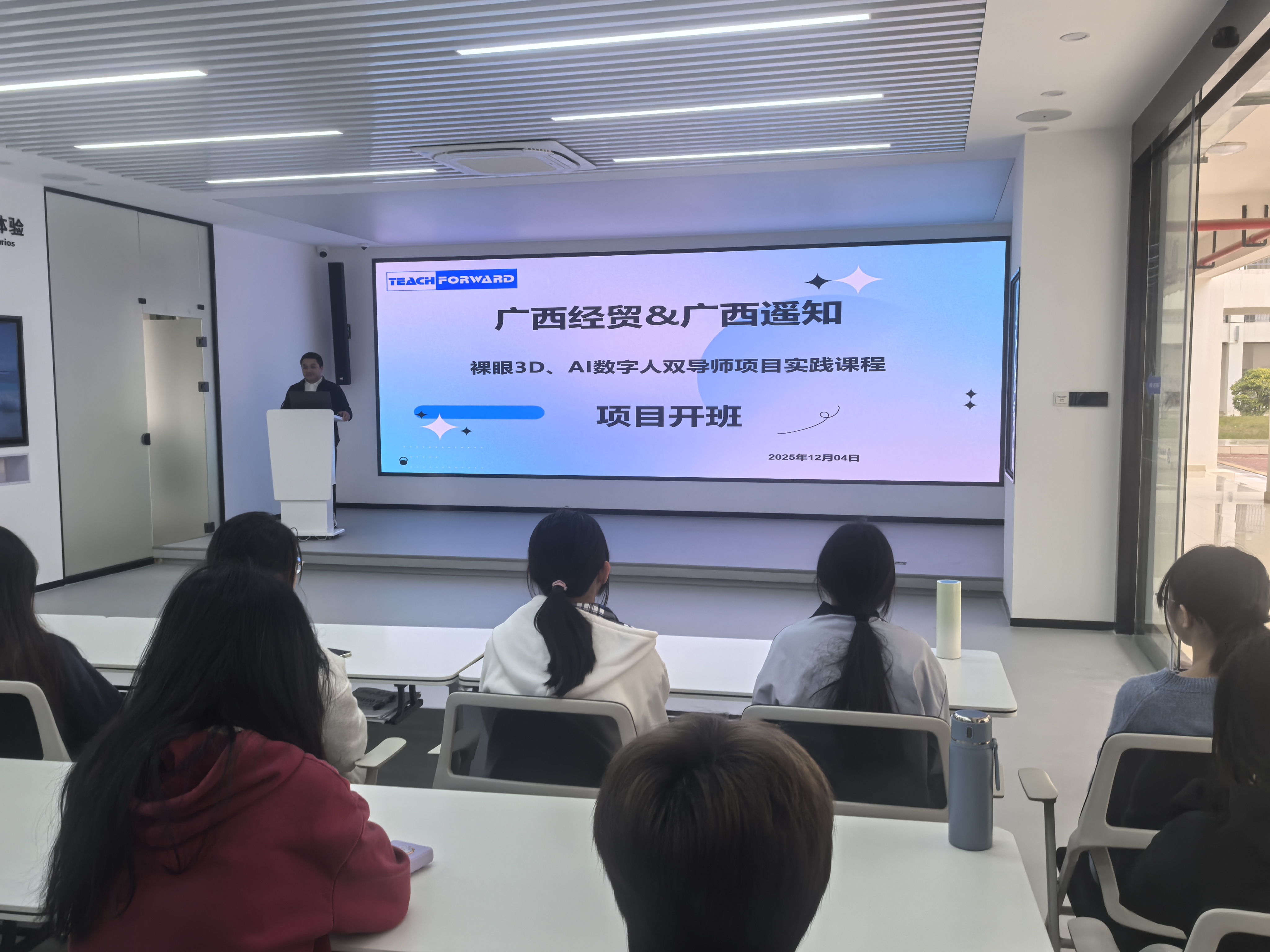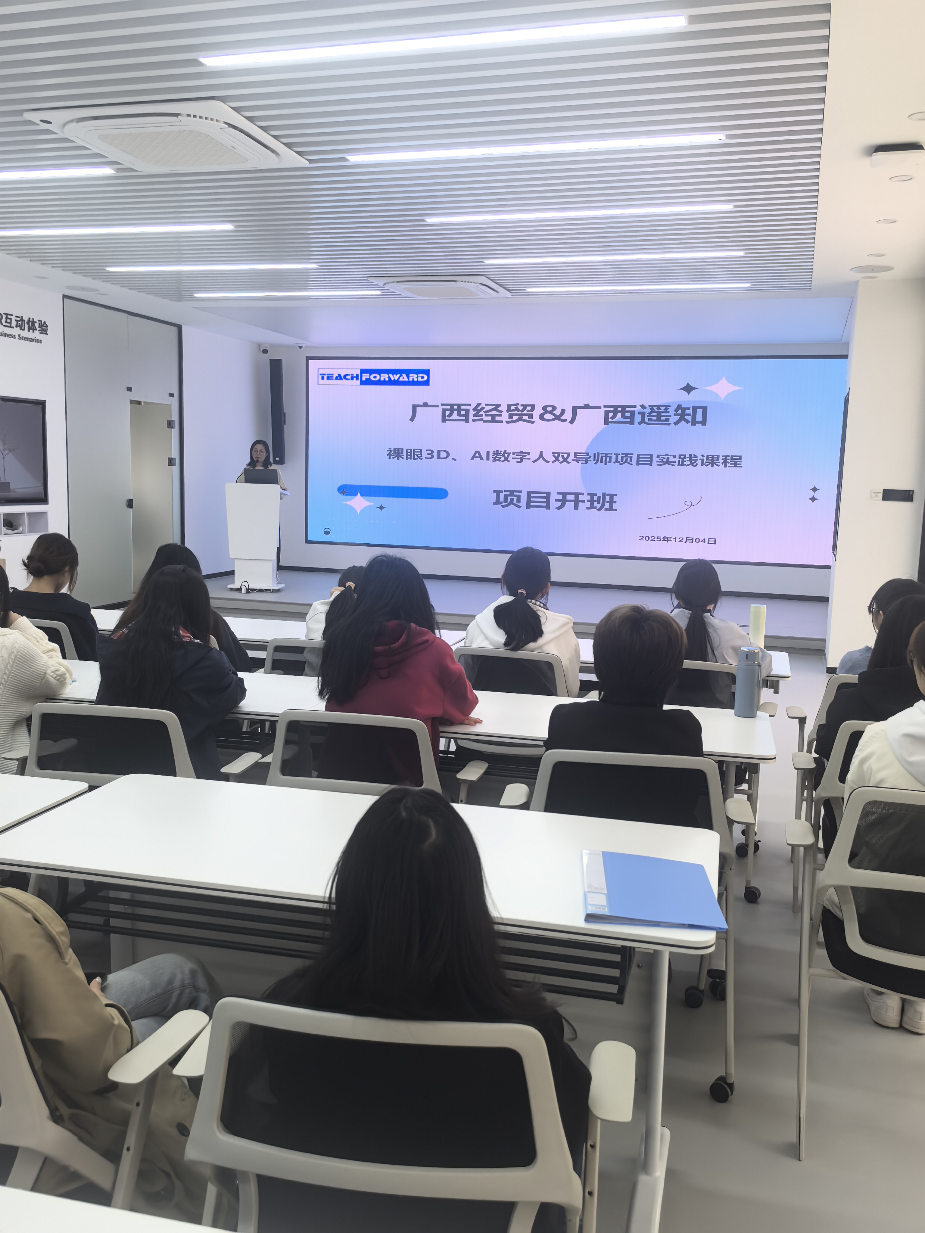 广西遥知与广西经贸职业技术学院联合开展的“裸眼3D、AI数字人双导师项目实践”正式开课。本次课程面向2024级数字媒体专业2个班级,旨在通过校企融合实战培养前沿技术应用人才。