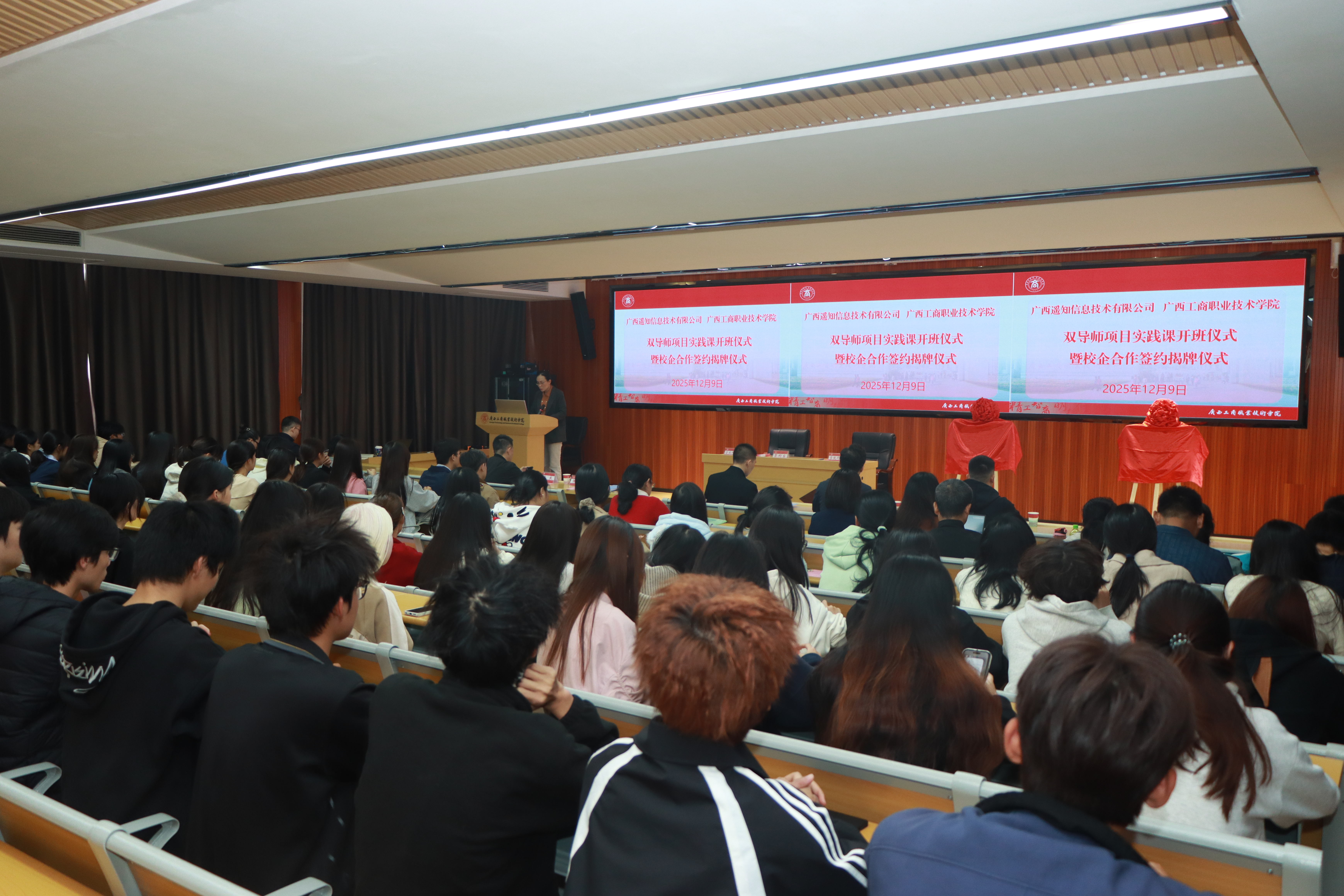 广西遥知与广西工商职业技术学院联合举办的“虚拟现实双导师项目实践课程”正式启动,并于举行开班仪式暨校企合作签约揭牌仪式。学院领导、遥知数字教育专家及技术团队、专业师生共同参与活动,标志着双方在产教融合领域迈向纵深合作新阶段。