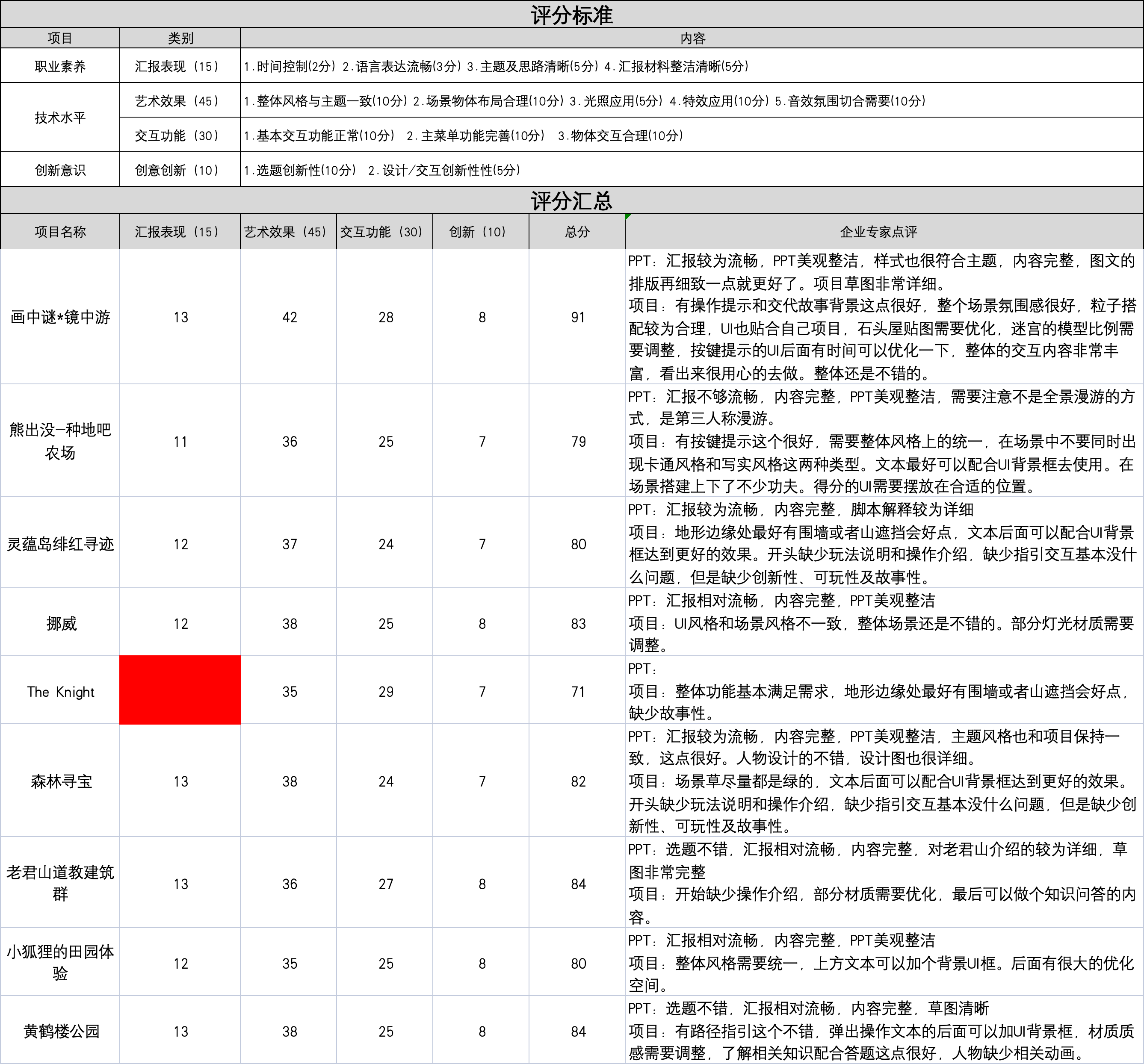 在结课答辩中,学生团队展示了涵盖环境建模、交互逻辑设计、用户体验优化等环节的完整项目成果。企业工程师与学校专业教师共同组成评审组,对作品进行综合评分,其中《画中谜·镜中游》项目凭借创新设计与技术实现荣获最高分。学校老师表示:“双导师模式不仅提升了学生的技术实战能力,更强化了其解决复杂产业问题的综合素质。”