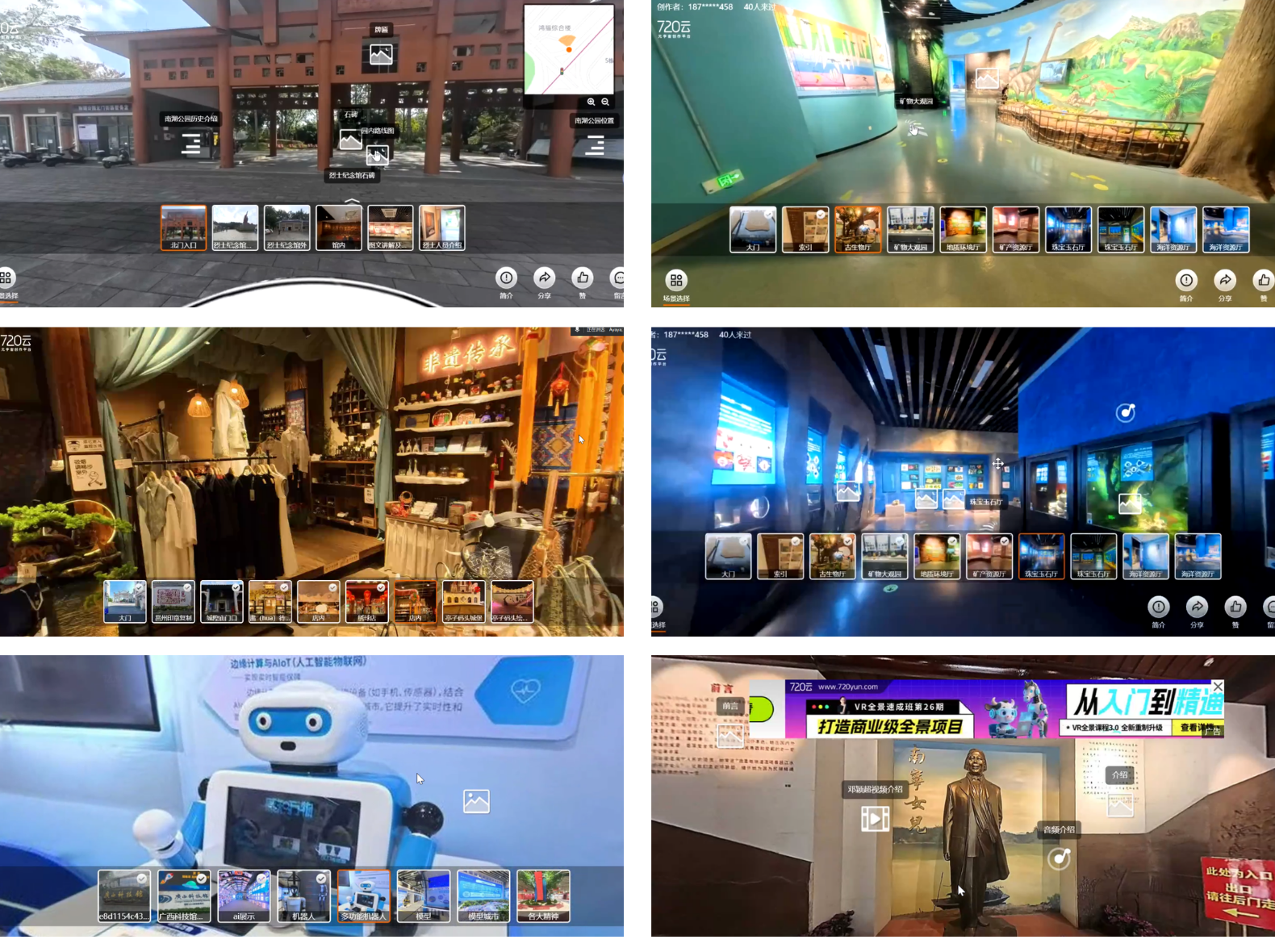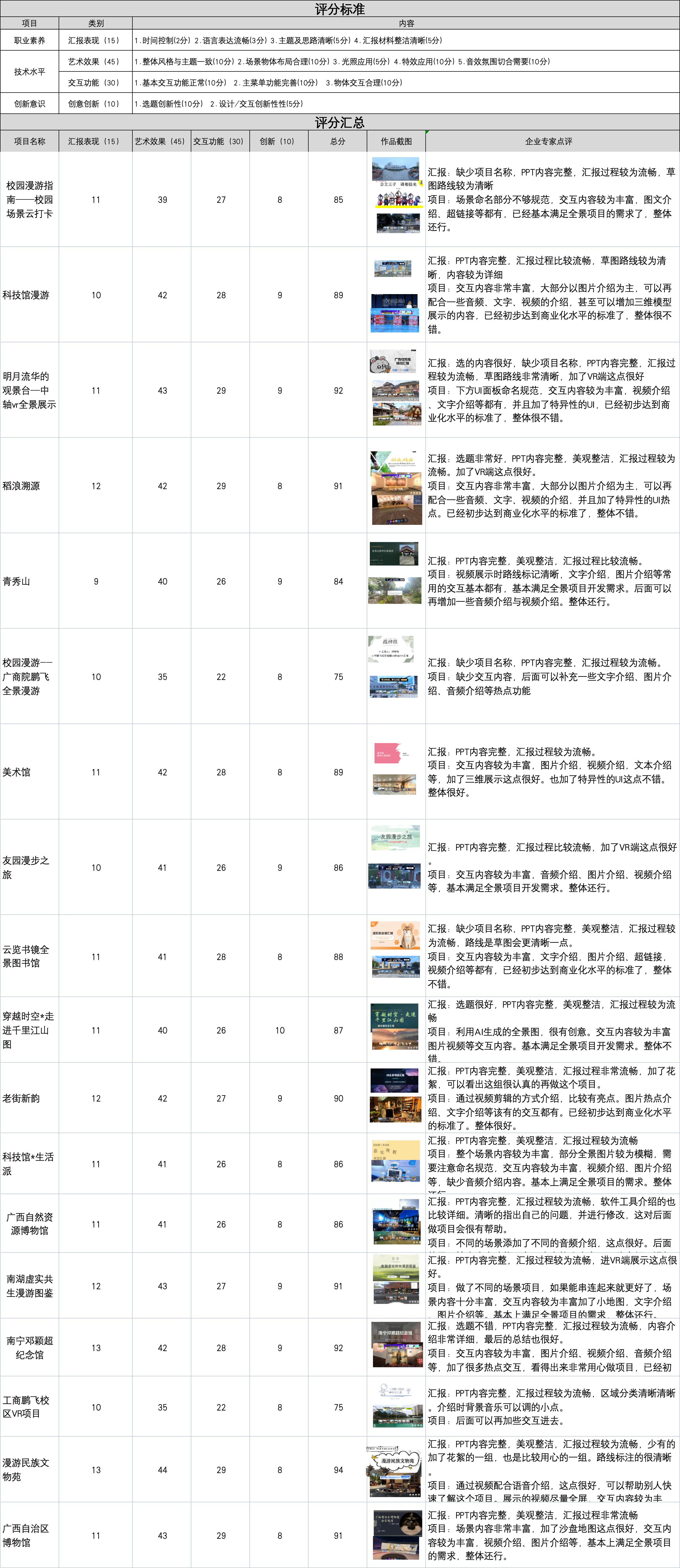 汇报环节中,18个小组依次展示自主开发的VR全景项目。作品在选题、交互设计、UI设计等方面已完全满足全景项目需求,部分作品还能通过超链接拓展全景场景数量及增加热点交互,甚至三维模型展示等,已接近行业标准,部分方案可直接投入商用。