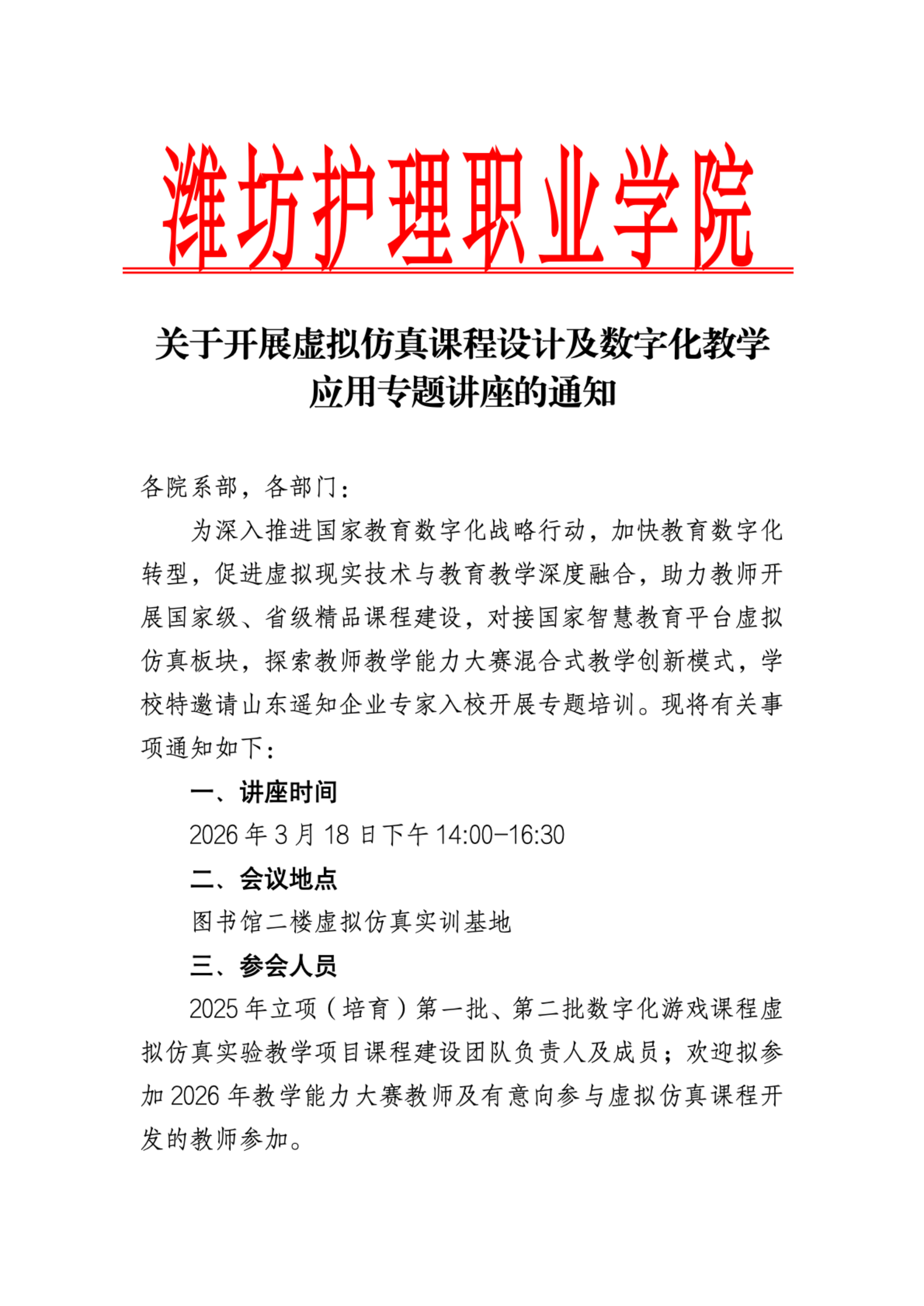 2026年3月18日,潍坊护理职业学院联合山东遥知举办了一场主题为“虚拟仿真课程设计及数字化教学应用”的专题讲座。此次讲座旨在推动学校教育数字化转型,提升教师数字化教学能力,助力培养适应新时代需求的高素质技能型人才。