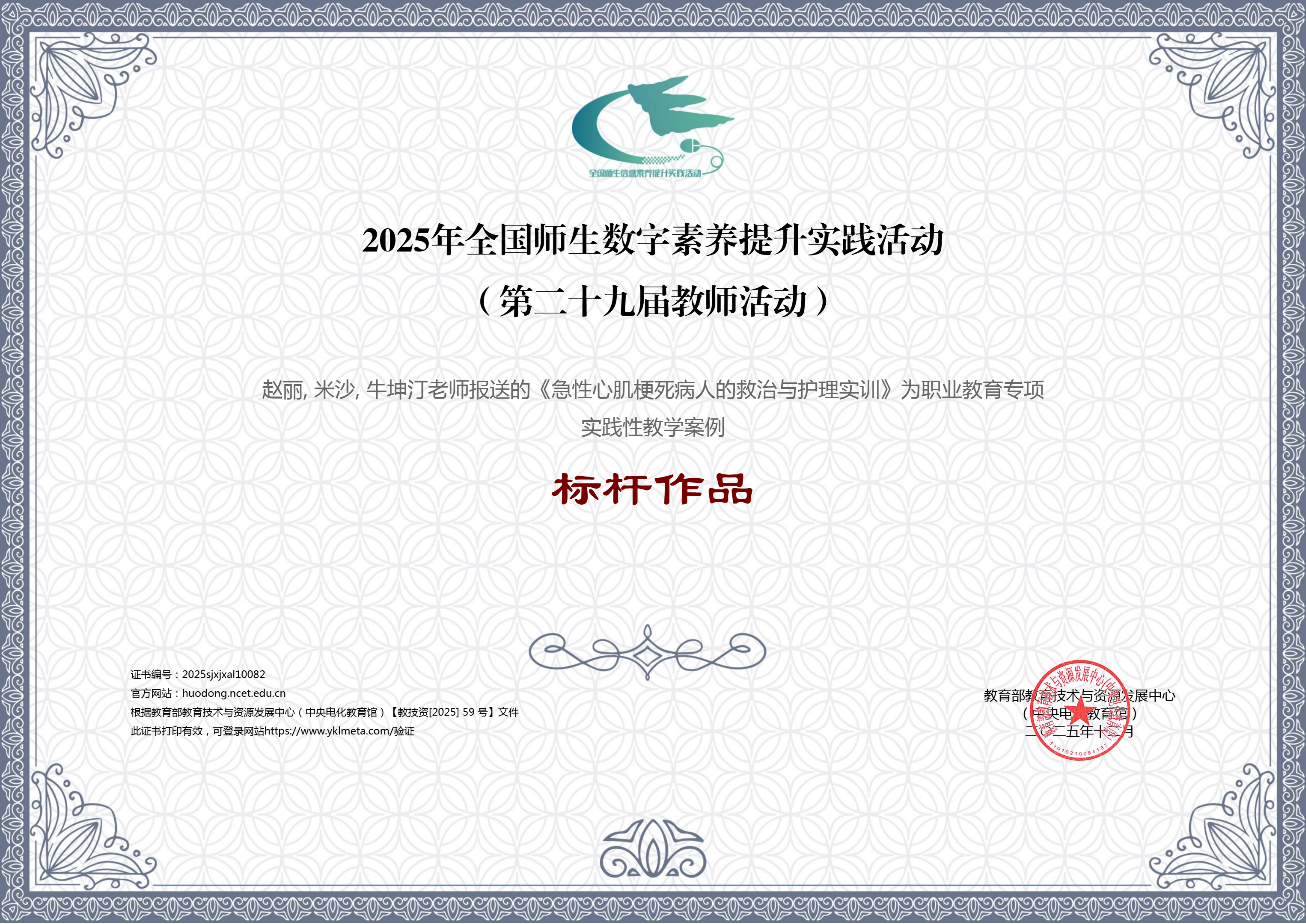 近日,由山东遥知科技提供技术支持潍坊护理职业学院开发的《急性心肌梗死病人的救治与护理实训》虚拟仿真课程,成功入选教育部教育技术与资源发展中心“2025年全国师生数字素养提升实践活动”评选结果,荣获“实践性教学案例”称号。该活动旨在推动教育数字化战略深入实施,遴选具有创新性、示范性的高质量教学成果,本次获奖充分体现了该项目在教学设计与技术融合方面的领先水平。